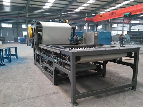 4、挤压辊高压脱水段。物料脱离楔形区就进入压力区,物料在此区内受挤压,沿滤带运行方向压力随挤压辊直径的减少而增加,物料受到挤压体积收缩,物料内的间隙游离水被挤出,此时,基本形成滤饼,继续向前至压力尾部的高压区经过高压后滤饼的含水量可降至最低。